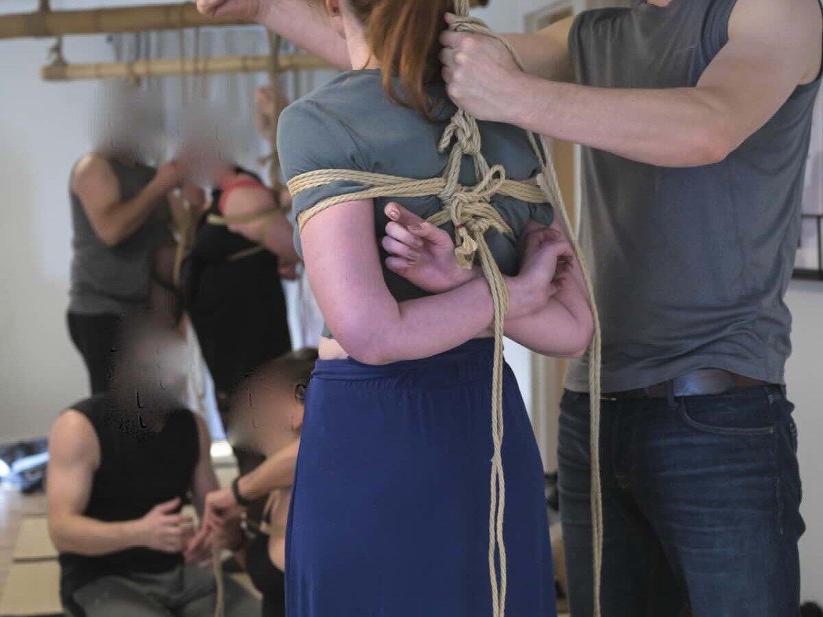 Man kan også tage på en begynderworkshop. Vi har lørdags- og søndagsworkshops for begyndere, hvor man i løbet af en dag vil modtage undervisning, så man har nok redskaber til at gå i gang med at binde derhjemme eller i Kinbaku Nexus en aften.